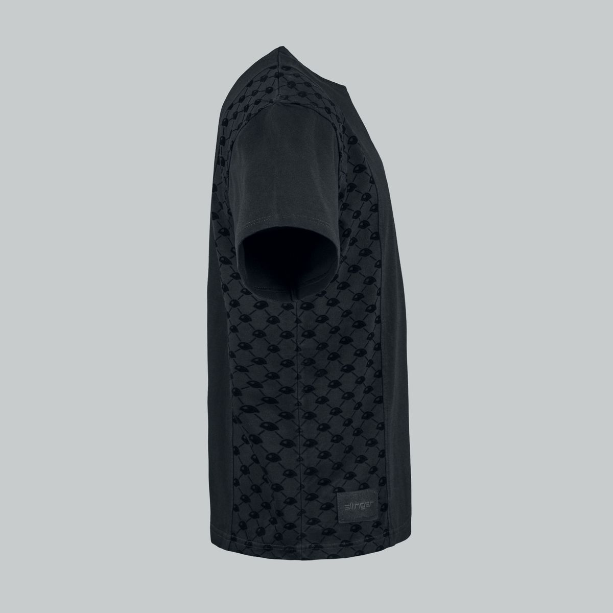 Two wide stripes with flock-printed logo patterns run from front to back across the shirt - noticeably raised, deep black, subtle yet striking. The embroidered eye sits on the chest as the brand's central distinguishing feature. At the bottom of the hem, a felt rubber patch with the ellinger logo makes a minimalist brand statement.