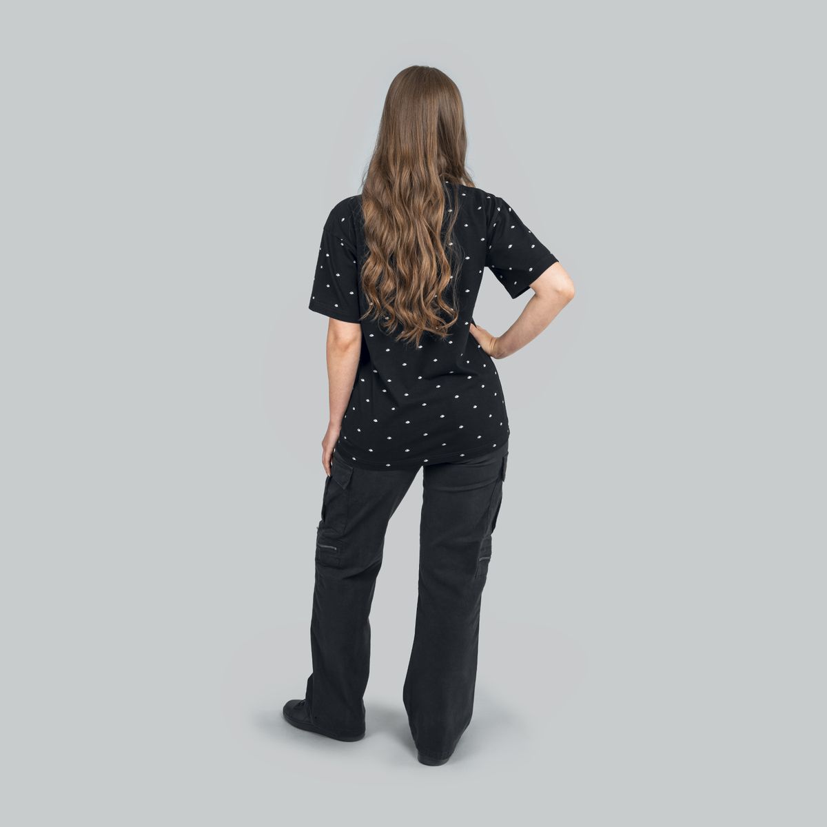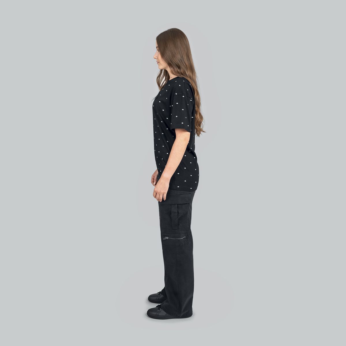 Made from 100% cotton, the T-shirt features a contrasting all-over print of small eyes. A single embroidered eye adorns the chest - precise, striking, iconic. A black felt rubber patch with the ellinger logo at the bottom hem provides subtle branding.